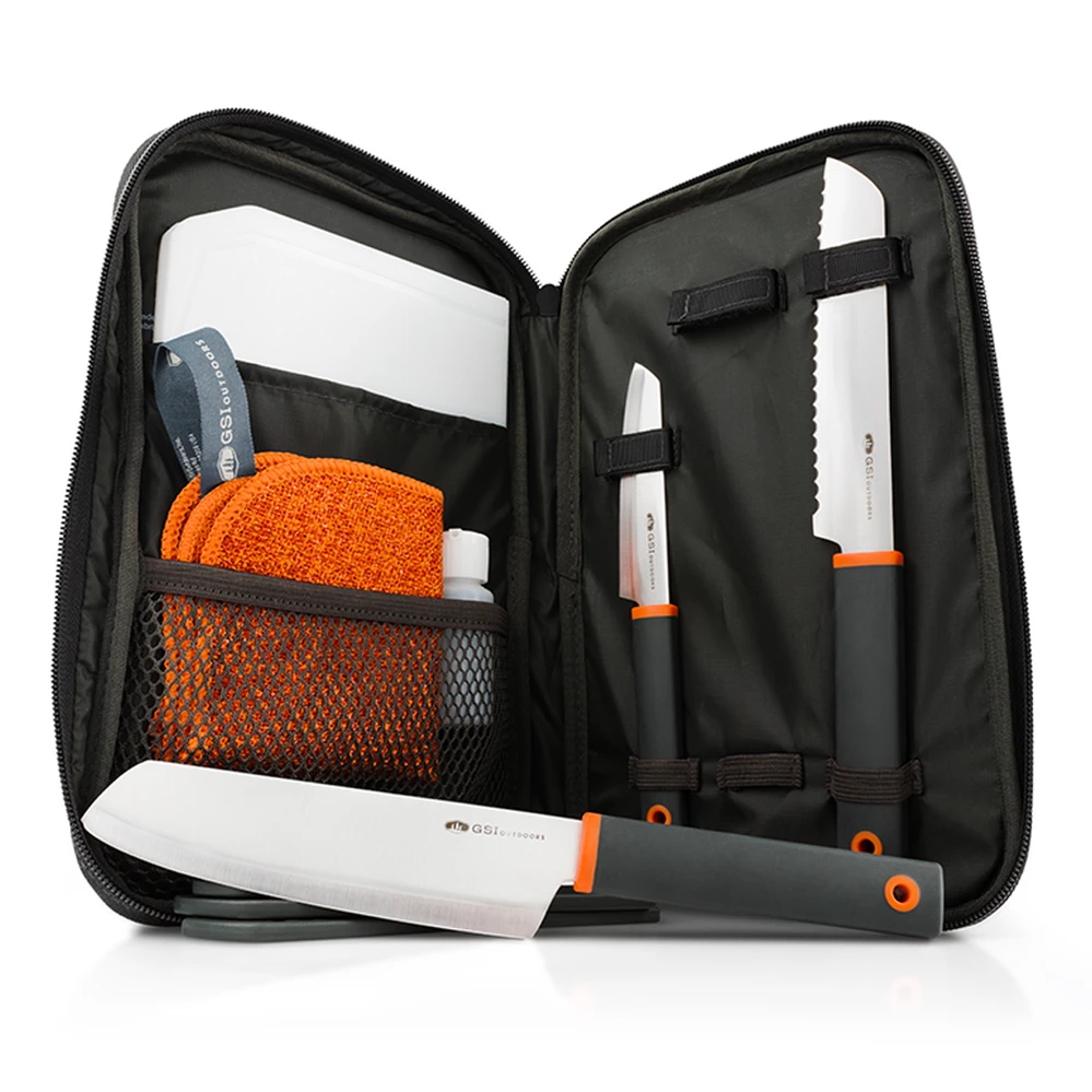 • Includes: 4 inch Paring Knife with Sheath, 6 inch Santoku Chef’s Knife with Sheath, 6 inch Serrated Bread Knife with Sheath, Folding Cutting Board, Soap Bottle, Dish Cloth, Ballistic Nylon Case