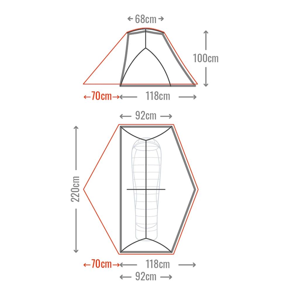 - Internal floor space: 2.31m2, 25% more than the average 1 person tent
