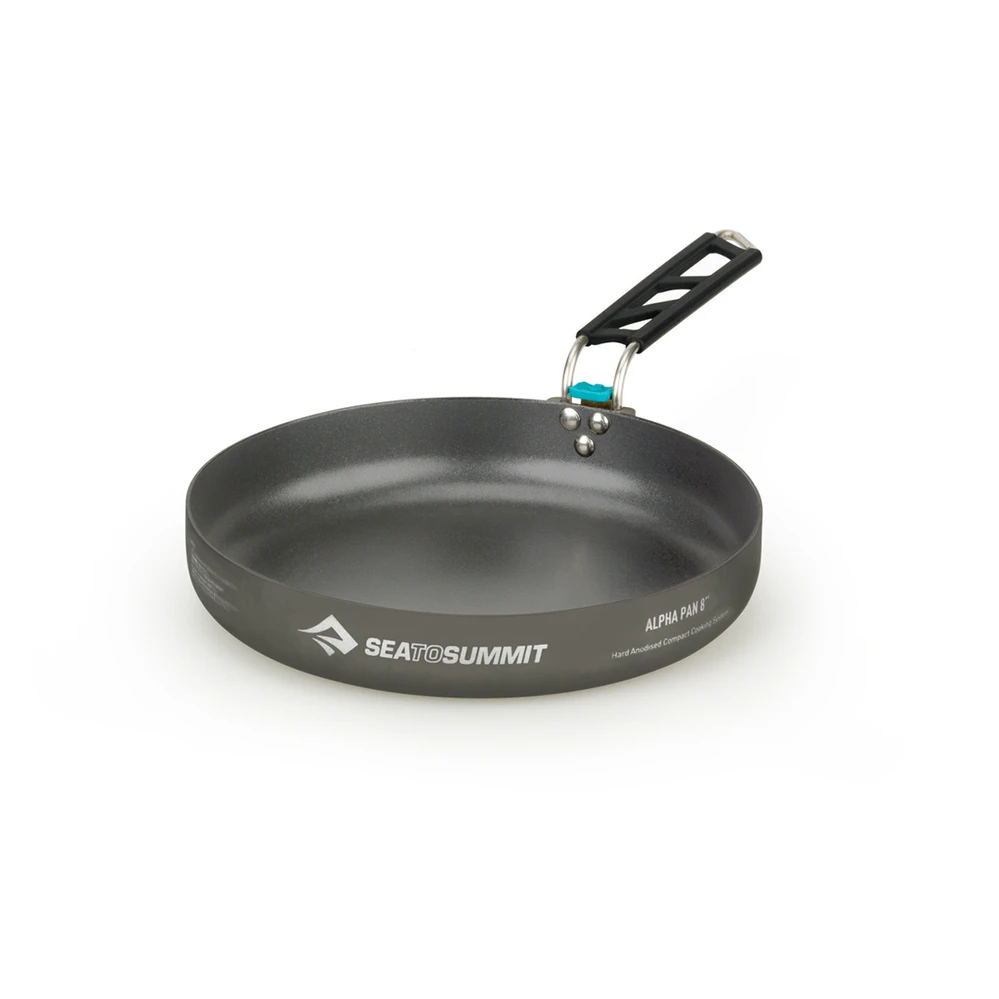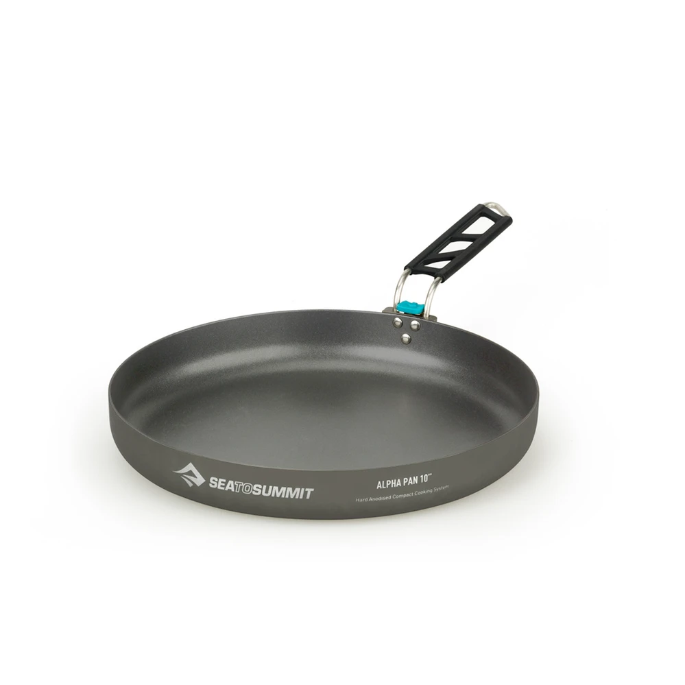 - Ergonomic, flip-up handle with safety lock folds underneath the pan when not in use for compact stacking and storage.